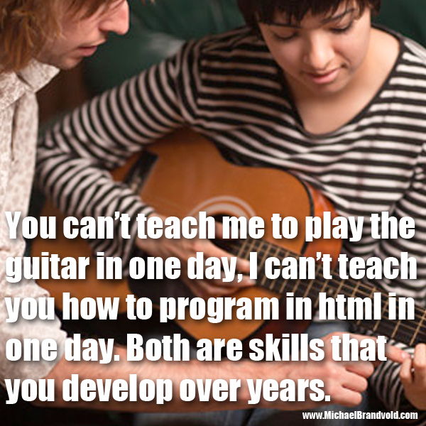 You can’t teach me to play the guitar in one day, I can’t teach you how to program in html in one day. Both are skills that you develop over years.