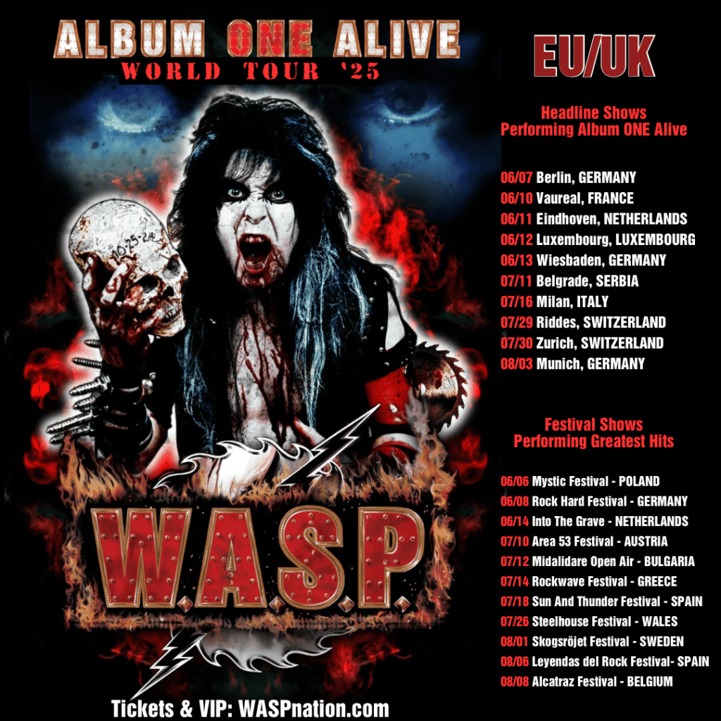 Hollywood, CA (December 11, 2024) — “Album ONE Alive!” marks the 40th anniversary of the release of W.A.S.P.’s first album. To celebrate this classic metal album, W.A.S.P. will, for the first time in 40 years, play the entire album from top to bottom, start to finish at headline shows across Europe. In addition, W.A.S.P. will be appearing at a number of European festivals, performing their greatest hits.